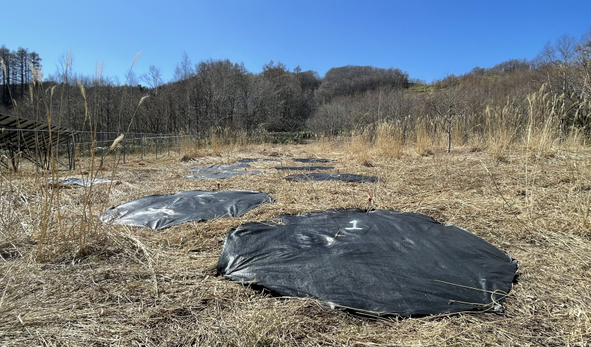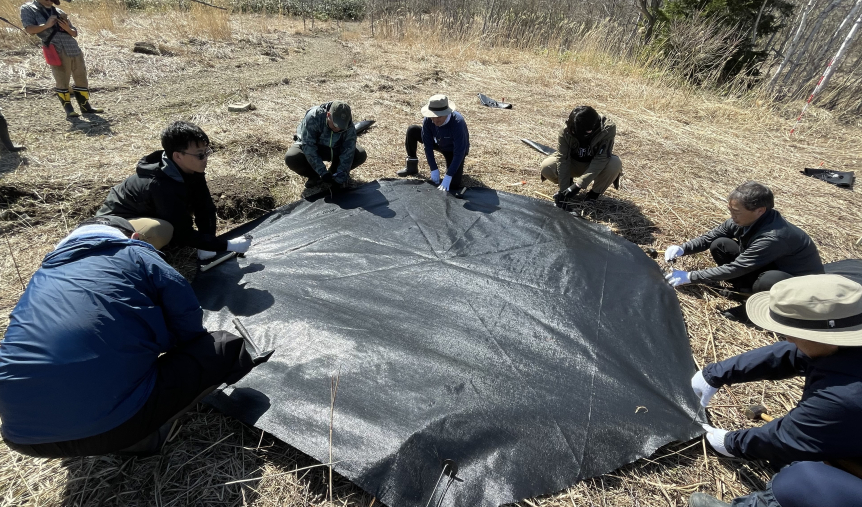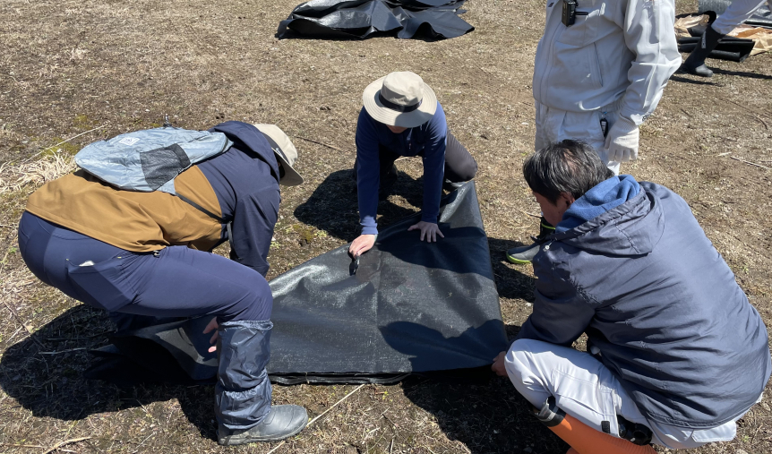防草シートを張って1年間ほど待ち、雑草を枯らしたところで春に盆栽苗を植樹します。試験施工は他にも何か所かで行う計画です。岡村先生や地元関係者の皆さんのお力を借りながら進めていきます。