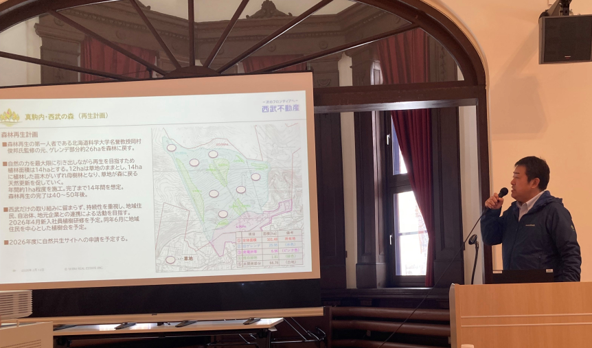 当社は「真駒内・西武の森における森林再生活動について」というタイトルのもと、旧真駒内スキー場のゲレンデをもともとあった自然に近い森に戻す取り組みと、この取り組みと生物多様性保全の関係について発表いたしました。