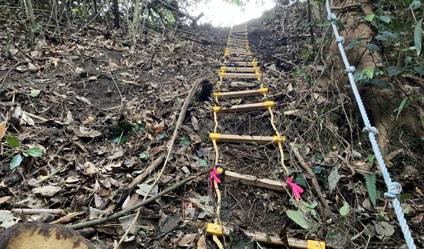 日南南郷プリンスホテル側から斜面に設置した縄ハシゴを使って場内へ進入します。作業場までは約600mほど緩やかな上りが続きます。ルート上には事前にロープを張っていただいており作業場まで迷うことはありません。
