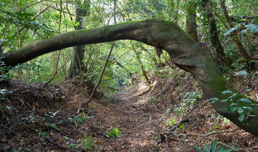 雨かと思えば雪になり、急に青空になったかと思えばまた雪と、目まぐるしく変化する天候の中鬱蒼とした場内を進みます。確かに人の歩いた痕跡はあり道形は残っていますが、そこかしこに倒木がありなかなかの荒地状態。支障木をなぎ倒し、あるいは迂回しながらルートを確保しつつ進みます。歩きながら、この土地をどのように活用するべきか思いを馳せます。人工林は森林整備だろうな、遊歩道を整備すれば公園的な利用もできそうだな、などなど。