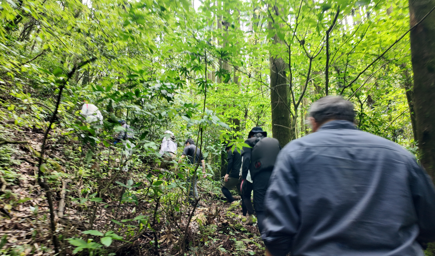 2025年5月、地元関係者の皆さまと社有地の現地視察を行いました。鹿屋市さまからNPO法人おおすみ100年の森さまを紹介していただき、2024年11月に関係者で意見交換会を行いました。その際、次は現地視察を行ってどのような森なのかを確認しましょうとの話になり、今回の現地視察に繋がりました。